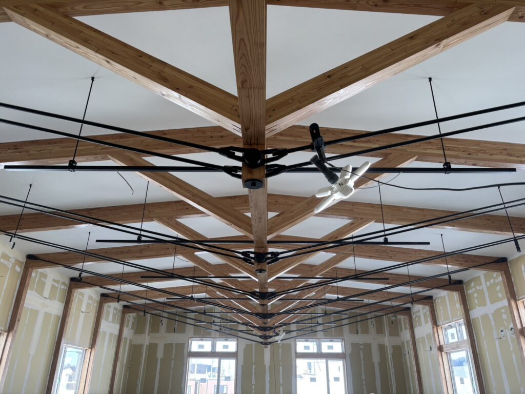 事務所内の足場が外れ、ハイブリッド張弦トラスがお目見え!!!圧巻です✨