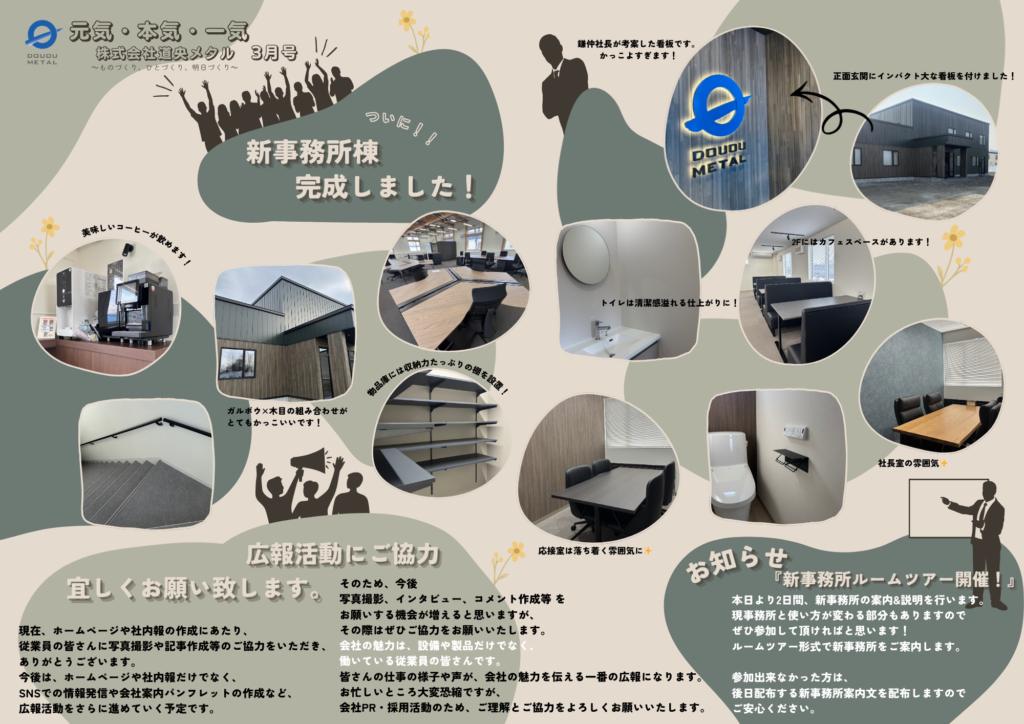トップ > 新着情報 > 元気・本気・一気(社内報3月号No.12) 新着情報 NEWS 2026.03.31元気・本気・一気(社内報3月号No.12) 社内報3月号ダウンロード 3月号の掲載が遅くなってしましましたが・・・ ついに、新事務所が完成いたしました!!✨ 去年の夏頃からスタートし、先日引き渡しとなりました。 新事務所工事関係者の皆様、本当にありがとうございました✨ これから、引っ越し作業等もありますが 従業員みんなで力を合わせて頑張ります!! 後日、新事務所の様子を掲載いたします。 お楽しみに~♪